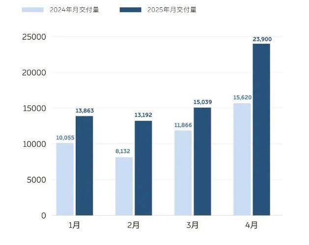 官方数据显示,2025年1~4个月,蔚来整体累计交付新车约6.6万辆。其中,4月新车交付量为2.39万辆,同比增长53%。以当前数据来推算,如果蔚来想要在今年实现年销44万辆目标,其接下来8个月平均销量需达到4.7万辆左右。