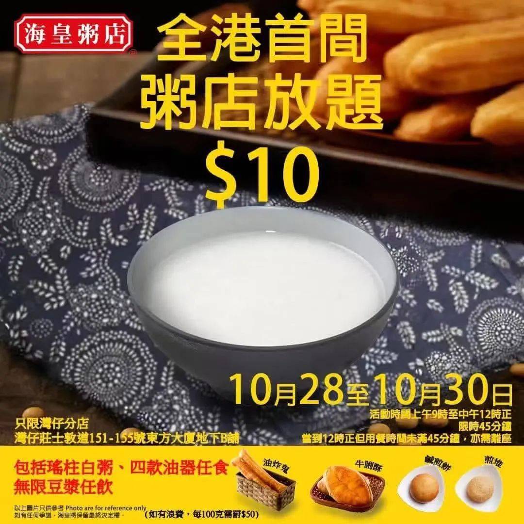 比如在去年10月底,海皇粥店在湾仔分店推出过为期3天的放题活动,消费者仅需花10港元即可在45分钟内任食瑶柱白粥、豆浆以及包括油条、牛脷酥、咸煎饼、煎堆在内的四款油器。而在平日的菜单中,一杯豆浆的售价就为10港元,此番让利,足见其缓解经营压力的迫切心态。