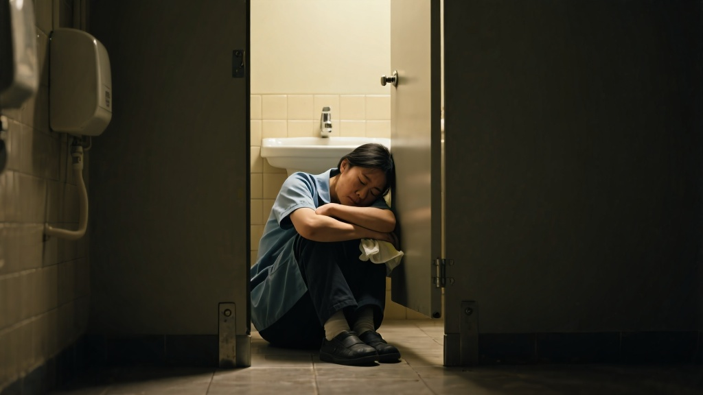 一天的工作下来,晚上九点半,秀珍已经连续工作了12个小时,商场里人流逐渐稀疏。距离下班仅剩半小时,她拎着拖把走到厕所门口时,一个年轻女孩从女厕里冲出来,着急地问秀珍,你有卫生巾吗?秀珍摇了摇头。女孩又问秀珍的同事,那你们知道商场里哪儿卖卫生巾吗?