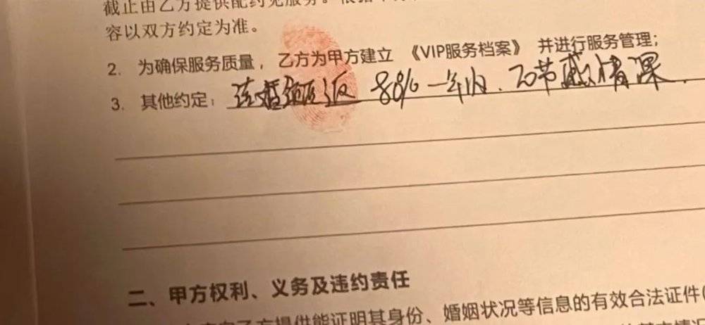 当时,她并没有仔细查看合同上的条款,只听到销售一直强调,三个月内会相亲成功,如果不成功的话也会一直介绍,直到成功为止,没有限额,便匆匆签下了字。