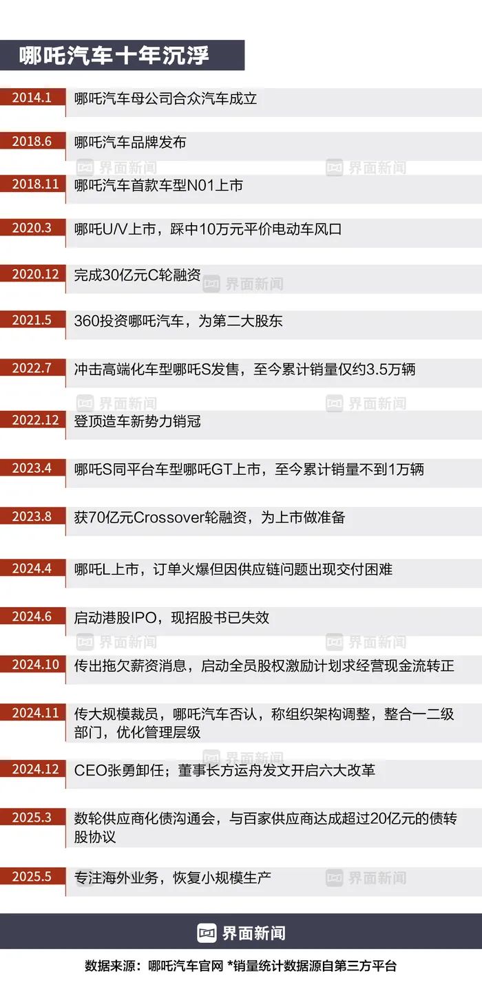 相类似的不良征兆已经在这家昔日的造车新势力销冠上显现。首先是桐乡和南宁两大工厂停工停产;紧接着公司内部裁员降薪,CEO张勇被更替。收不到回款的经销商和供应商开始诉诸法庭,要求哪吒汽车进入破产重整程序。社交平台还一度传出丰田将收购哪吒汽车的消息。