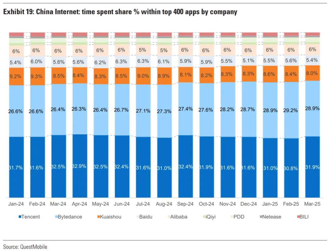 3月腾讯生态的用户时长占比环比有所抬高,或受益元宝App的拉动。但与此同时,字节系仍然保持领先差距。这也预示着,腾讯和字节,在下一代最大的流量入口上,必有一战。