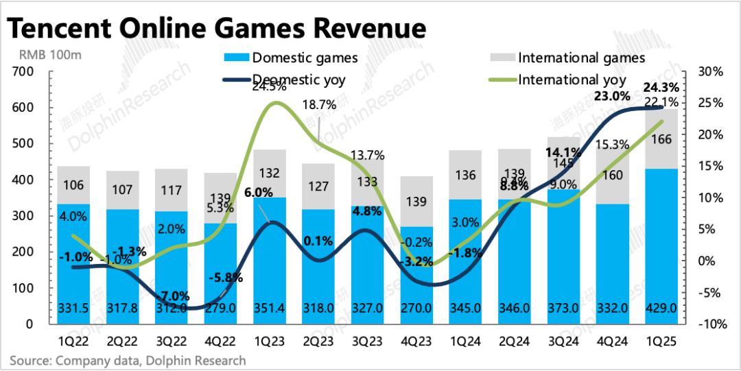 一季度网络游戏收入595亿,同比增长23.6%,除了《DNF》手游、《三角洲行动》的贡献,长青游戏在一季度对超预期的增长起到了决定性作用——本土长青游戏《王者荣耀》、《和平精英》,海外长青游戏《荒野乱斗》、《部落冲突》等。