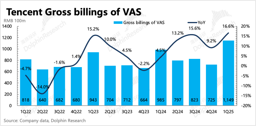 1. 长青继续发力,游戏大超预期:Q1游戏增长24%,撇开预期,也是一个强悍的增长。除了《DNF手游》、《三角洲行动》的增量外,《王者荣耀》、《和平精英》这两款古老的长青游戏,春节期间在内容更新和运营活动下,流水表现也非常不错。海外收入依然由《PUBG》手游、Supercell旗下经典游戏贡献高增长。
