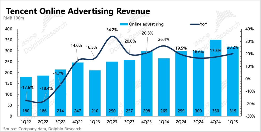 一季度大环境勉勉强强,但腾讯广告增长20%,高基数上反而进一步提速。市场有一定积极预期,但腾讯实际表现更佳。