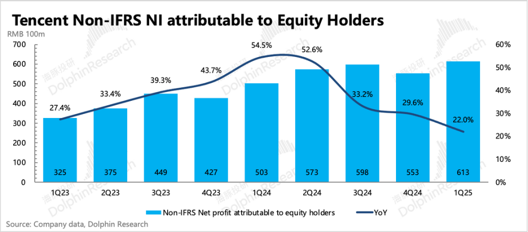 不过Q1炸裂的业绩,游戏贡献不小。但从Q2开始,DNF手游的高基数影响也会开始施加压力,这意味着从大趋势上看,整体利润增速会放缓到一个新区间。因此,AI能否给腾讯再次点火起飞的源动力,也是市场上多头资金最期待的看点。