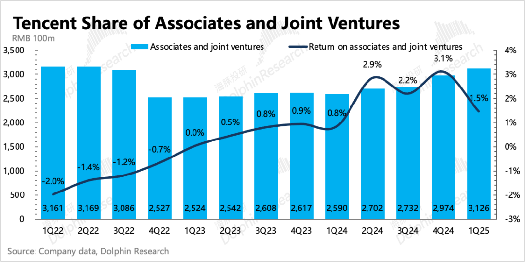 截至一季度末,公司联合/合营资产规模合计3126亿,计算得一季度腾讯的投资收益率为1.5%,同比略有提升。从2022年至今,总体上呈现良性向好的趋势。