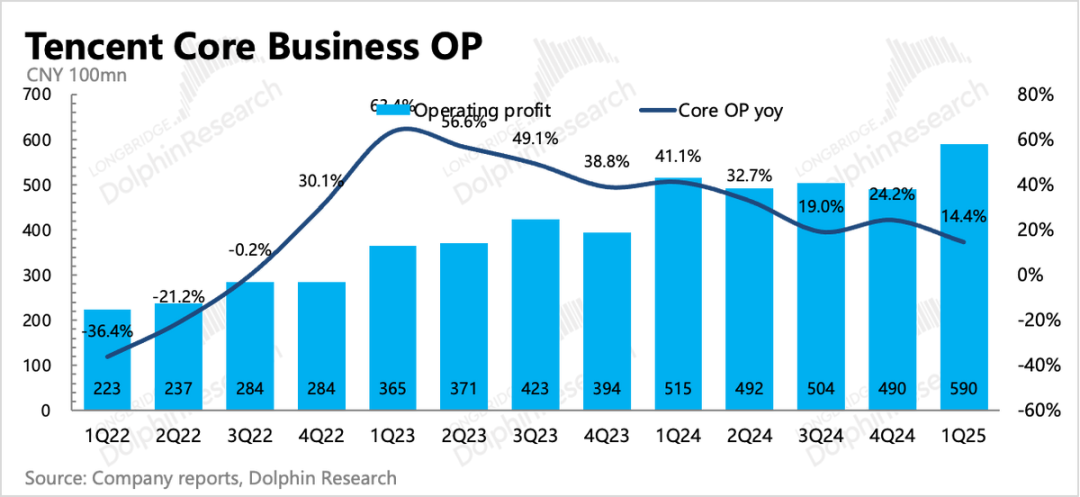 一季度经调整净利润613亿,比市场预期的597亿要高,但从核心主业的经营利润(=毛利-三项经营费用)来看,如果剔除将育碧重组合并而产生的40亿一次性股权薪酬支出,那么实际核心经营利润明显超过市场预期,利润率达到35%,同比提升了3pct。