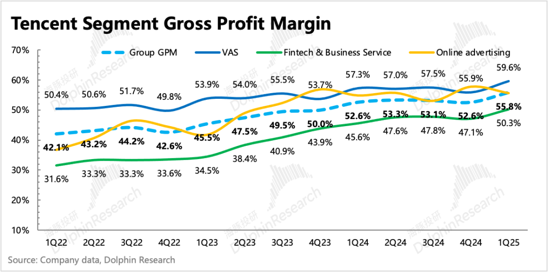 游戏和广告是毛利率相对比较高的两个业务,因此这两座金矿持续高增长,无论是对毛利率还是现金流都有不错的拉动。一季度毛利率同比提高3pct达到55.8%,创历史新高。