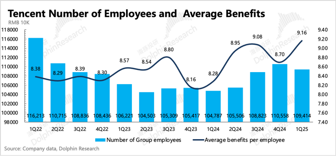 从雇员人数上看,一季度相比四季度末也环比减少了1144人。这里面不排除通过AI优化了人员结构,比如从研发人员开支来看,在AI加速渗透的Q1,研发人员薪酬同比增速14%,反而低于上季度增速。