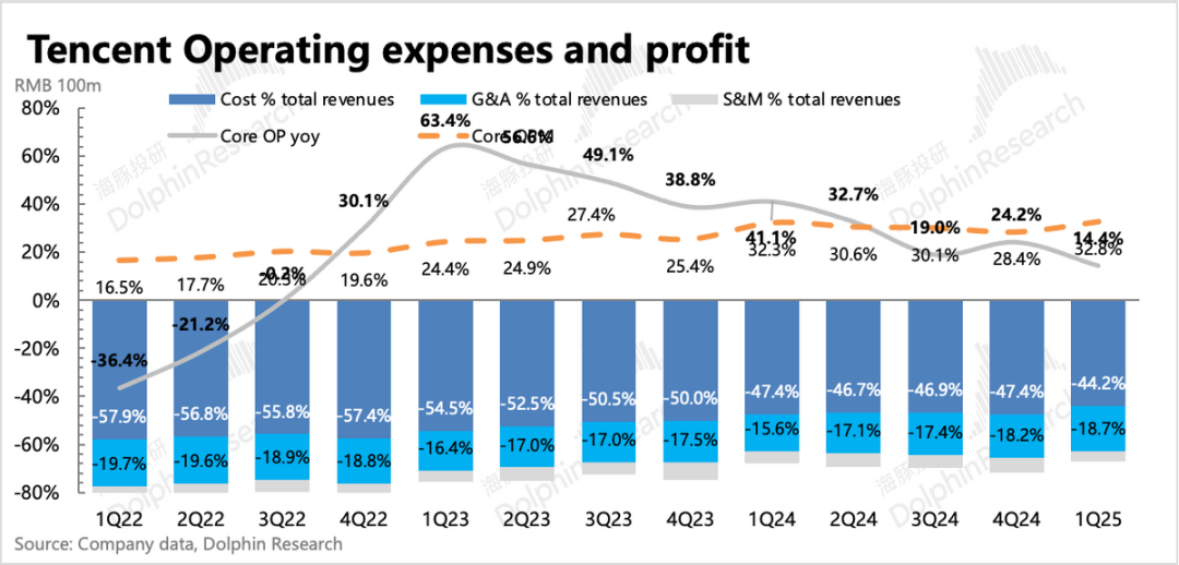 但与AI投入不直接相关的管理、销售费用,就有持续优化的动力了。一季度主要优化的是销售费用,尽管有密集的游戏活动和元宝的史诗级推广,但销售支出持平。管理费用虽然增长17%,但两者合计并剔除重组费用,同比只增加了11%,均低于收入增速。