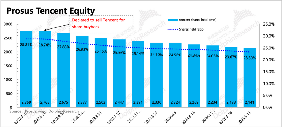 最后简单来看下回购与抛售情况。从上次财报披露至今的2个月,腾讯因为有员工期权授予和静默期不能回购的原因,总股数存在净增加。与此同时,大股东减持力度也未减弱,两个月抛售了近3200万股,在腾讯中的股权占比降至23.3%,下降0.37%。
