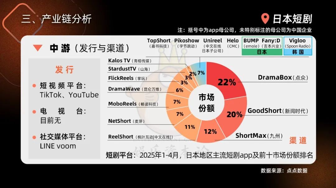 据点点数据,2025年1~4月,日本短剧应用内购收入3080.5万美元,市场份额排名前十的公司均为中国出海平台,总市场份额已经占到日本地区90%以上。