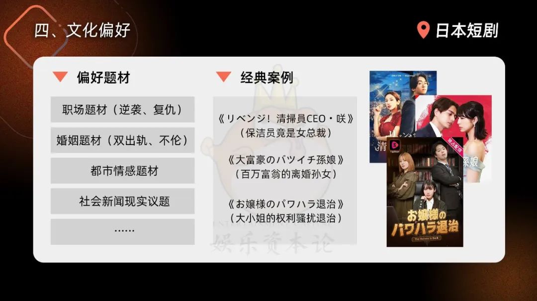 东方不败entertainment想从内容题材、爽点、摄影等方面更偏向日本风格,比如日本人喜欢的婚姻题材短剧是双出轨,“类似《昼颜》那种,故事大概脉络是,老婆发现老公出轨,各种搜集证据,但如果在中国短剧,可能第一集女主就和老公离婚了。”