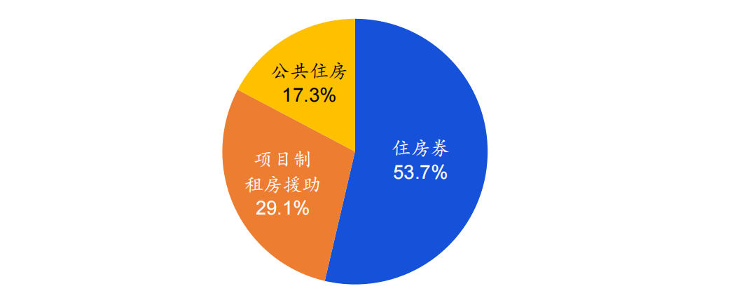截至2023年,纳入美国住房援助体系的住宅数量约为513万单位,占美国住宅存量总规模的3.6%,低于2022年OECD国家的平均水平(7.1%,见图2)。约905万居民获得住房援助,占美国总人口的2.7%2。目前,在住房援助的三种主要形式中,公共住房占比仅有17.3%,项目制租房援助占29.1%,住宅券补贴占比最大,达53.7%(图3)。