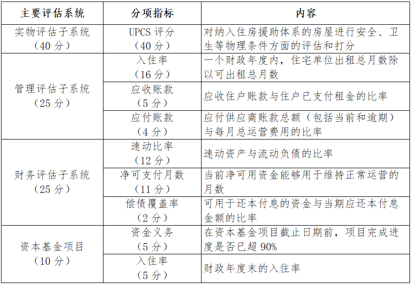 美国住房与城市发展部(HUD)针对不同住房援助项目建立了多维度的监督与评价指标体系,并据此调整对地方公共住房机构的“奖惩”措施,以防止地方政府“重供应、轻管理”、“重数量、轻质量”的倾向,避免出现由于房屋位置偏远或质量低劣导致入住率偏低(甚至大量闲置)的现象,确保住房援助项目给当地居民带来了实实在在的福利。这些监督与评价体系为地方政府开展公共住房(保障房)的建设、筹集、分配、运营、维护等提供了有效的激励与约束机制。