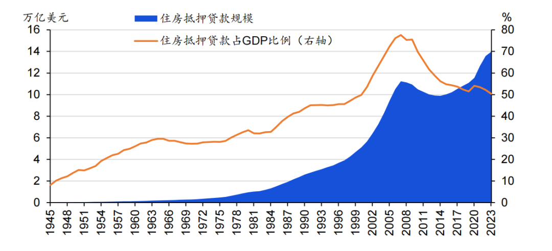 得益于上述机构的设立,美国的住房抵押贷款快速增长。到2023年底,美国住房抵押贷款规模已接近14万亿美元,与GDP的比率由1945年的不到2%升至超过50%(图4)。根据联邦住房金融局(Federal Housing Finance Agency,FHFA)的数据,1963年,美国新增住房抵押贷款平均到期期限为21年,贷款/价值比约72%;到2023年,这两个指标已分别上升到2029年和81%,抵押贷款已成为购房者便利可靠的融资工具。