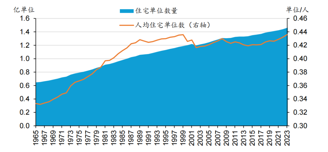 另一方面,美国的住房抵押贷款市场发达,住房融资、建设及交易高度市场化,运行效率高,有力支持了私人住房市场的迅速发展。1965~2023年间,美国住宅数量由约6,500万增加至1.46亿单位,人均住宅数由0.33单位增加至0.44单位(图6)。