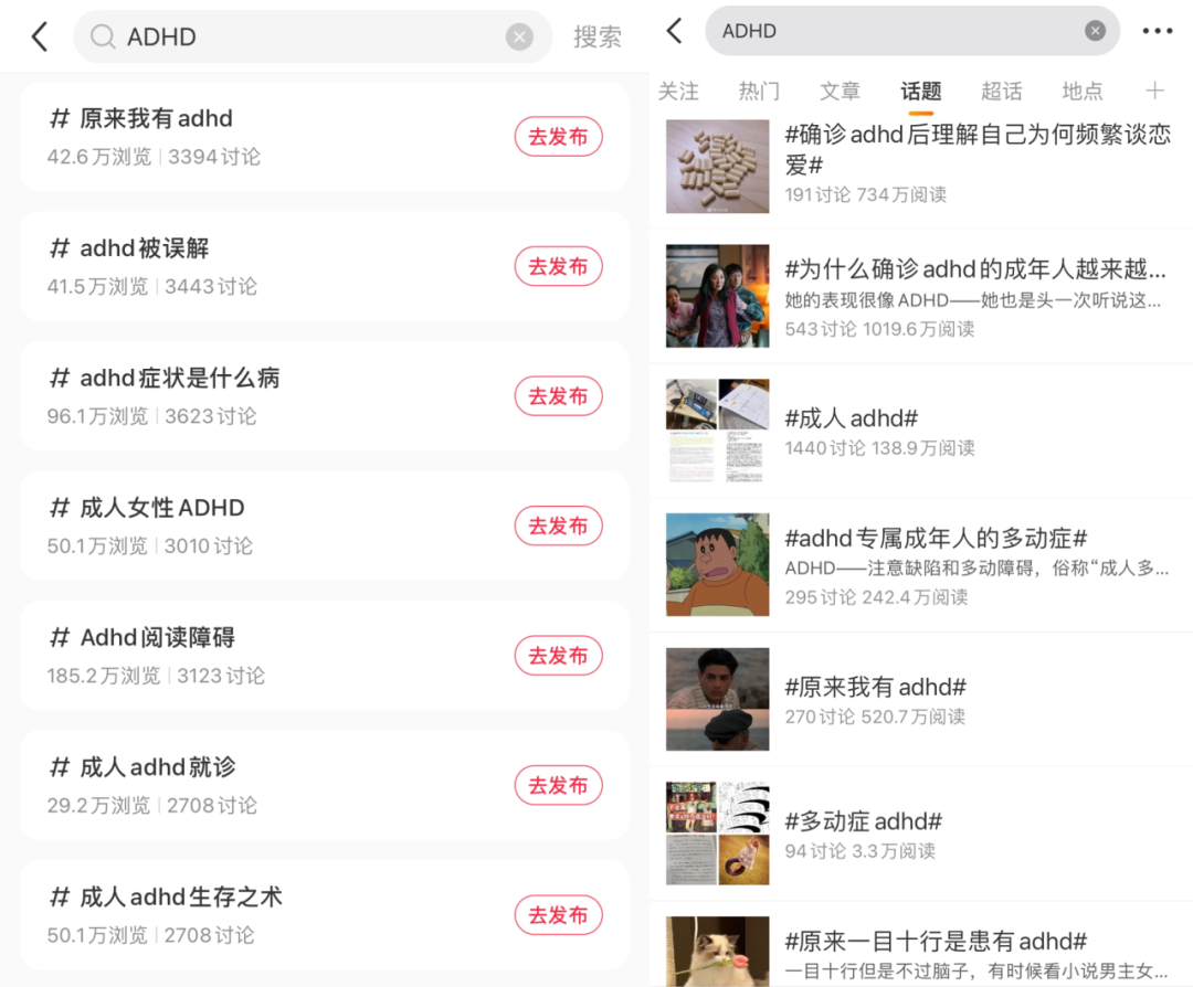 小红书、微博上的“ADHD”相关话题