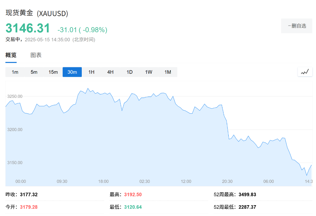 5月15日周四,现货黄金日内跌幅达1.5%。截止发稿,报3146.31美元/盎司,已从3500美元的高点回落10.1%。