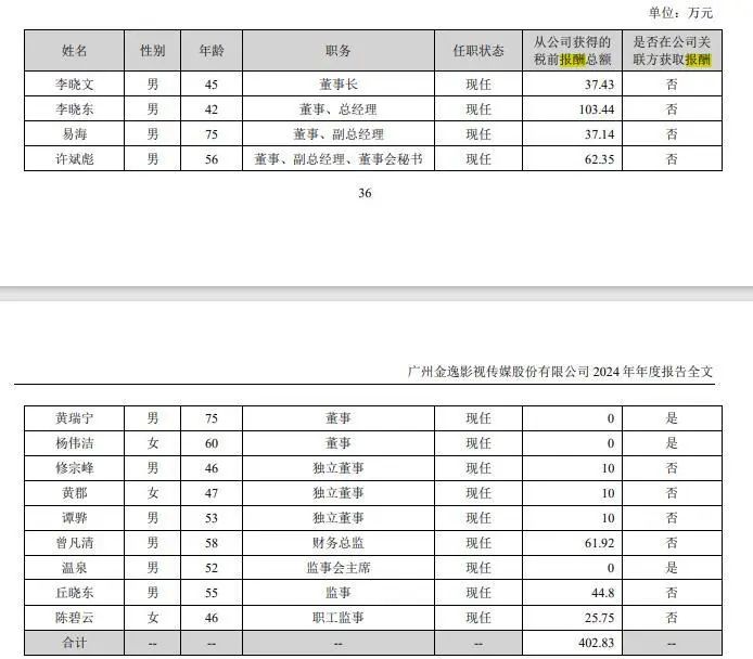 行业下行压力下,不少董事长获得的报酬也在下降。金逸影视董事长李晓文2024年年报酬37.43万元,同比下降14.6%。是所有影视上市公司董事长中,从公司处获得年报酬最低的一位。
