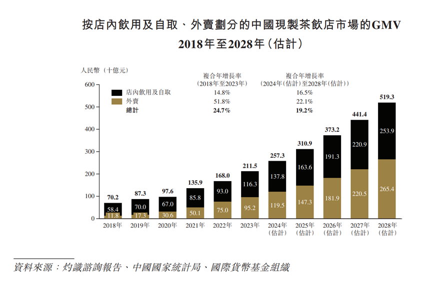 随着这些年来消费者外卖习惯的不断成熟,外卖依赖已经成为茶饮的一种行业标签。据多家茶饮上市企业招股书中所引用的灼识咨询数据,中国现制茶饮店外卖服务(区别于店内饮用及自取)的GMV,由2018年的人民币118亿元,增加至2023年的人民币952亿元,复合年增长率为51.8%;外卖GMV占比也从2018年的16.8%,迅猛增加至2023年的45.0%。