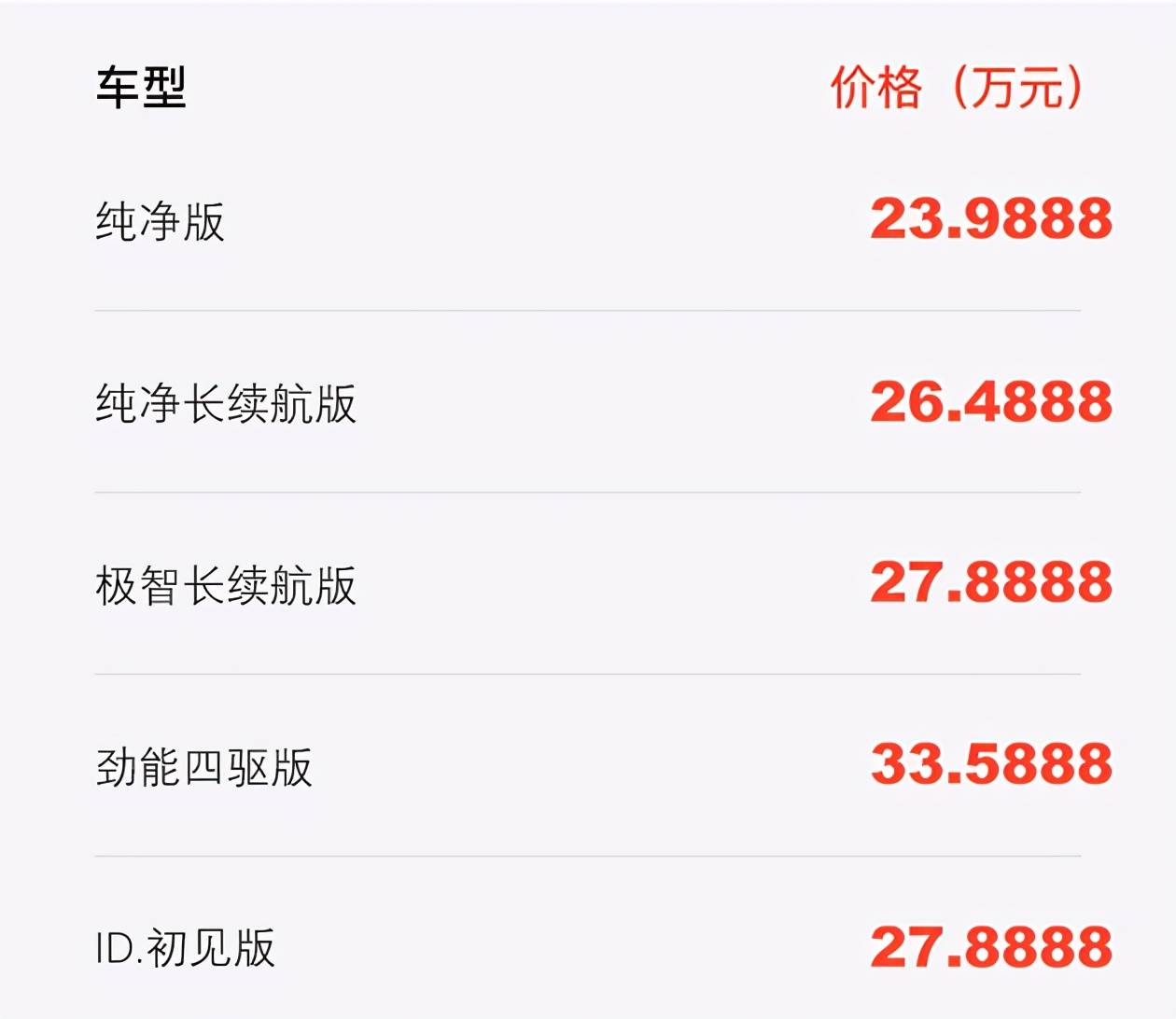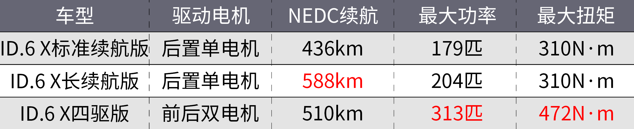 至于动力部分,售价239,888元的最低配标准续航版采用后置低功率电机驱动,NEDC续航436km。而售价335,888元的顶配车型采用双电机四驱,NEDC续航510km。其余版本则均为后置高功率电机,NEDC续航588km。从动力和续航的参数也可以看出,ID.6 X并非以性能为卖点的车型,它主打的还是大空间和性价比。毕竟不到30万的价格,一线合资品牌能提供续航588km的7座纯电中大型SUV,还是很有诱惑力的。