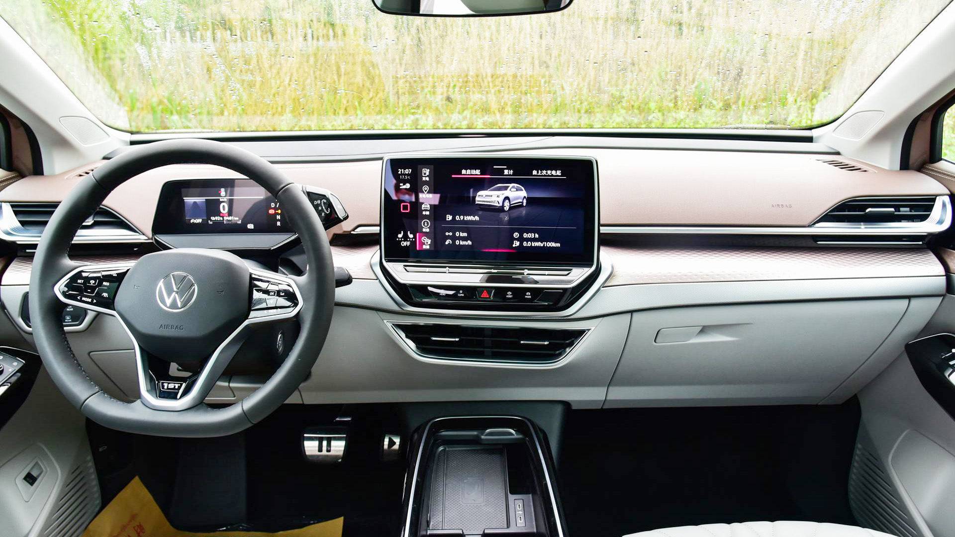 ID.6 X内饰走的是简约风格,驾驶员视线前方是一块只有5.3英寸的全液晶仪表,只用来显示时速、续航等关键的行车信息,避免过多的信息造成干扰。其它的车机功能都被集成在了中控台12英寸的悬浮式触控屏内,内部使用了大众最新的MOS 4.0交互系统,支持非常丰富的互联网在线功能,以及OTA升级。