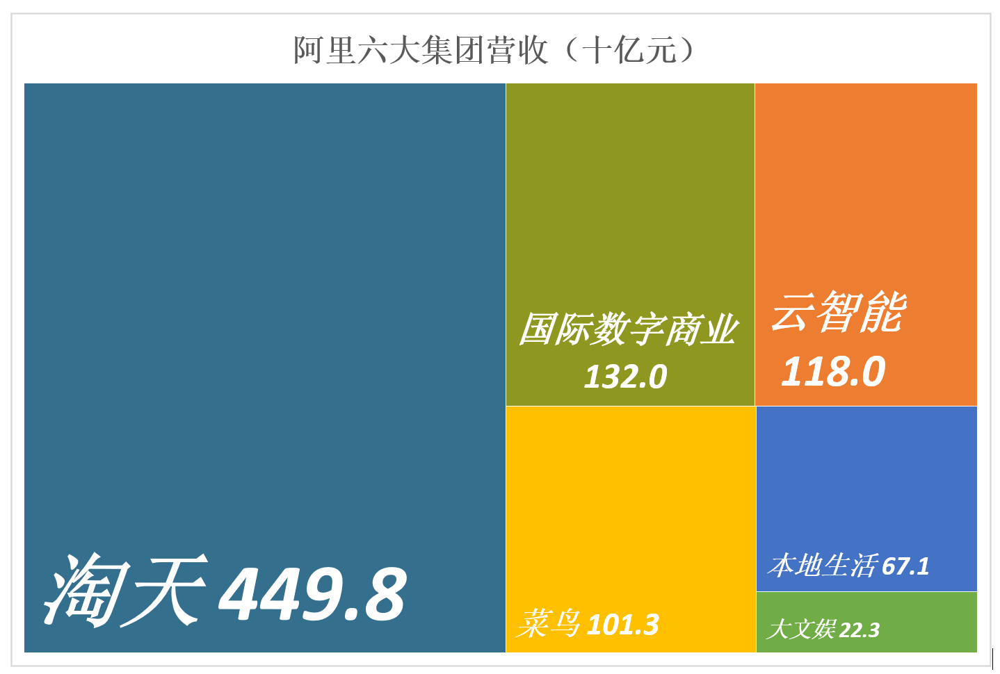 老大淘天集团(4498亿),老二国际数字商业集团(1323亿),老三云智能集团(1180亿),老四菜鸟集团(1013亿),老五本地生活集团(671亿),老六大文娱集团(223亿)。