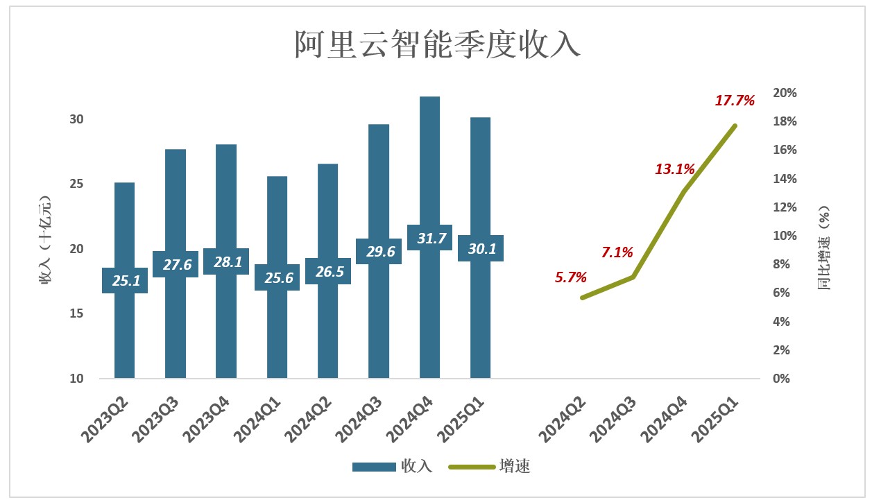 新增的AI功能几乎免费,却有力地推动收费服务增长,AI相关收入连续7个季度实现三位数增长,云智能板块财年收入增速达11%。其中,2025年Q1增速接近18%: