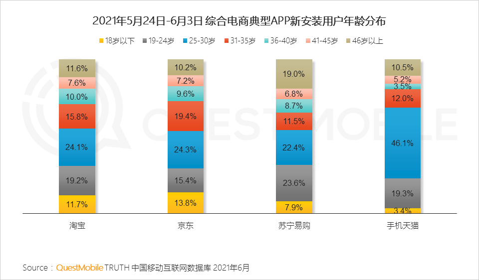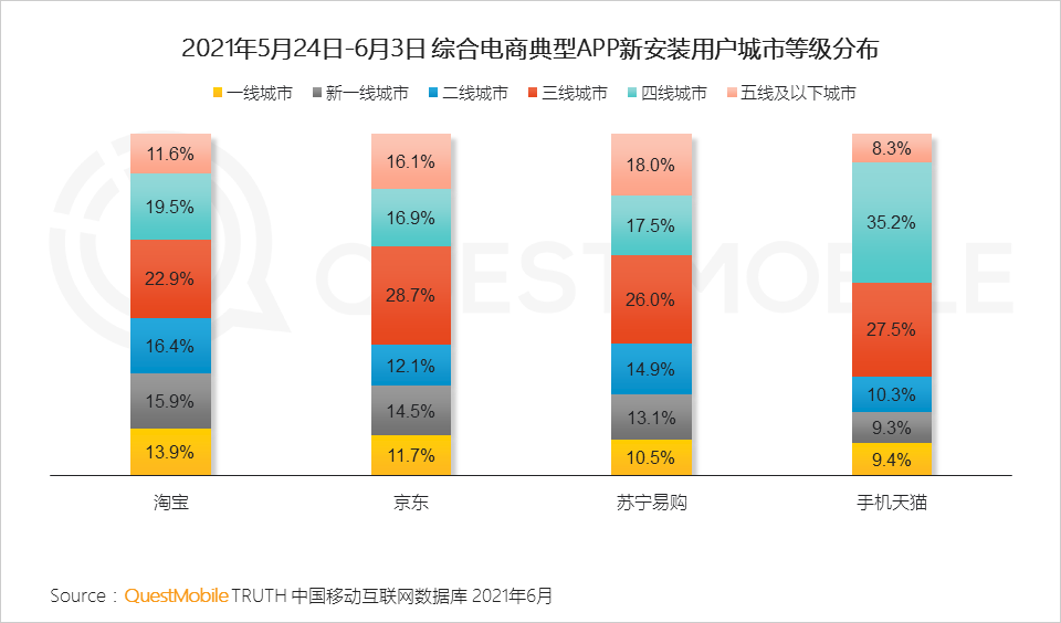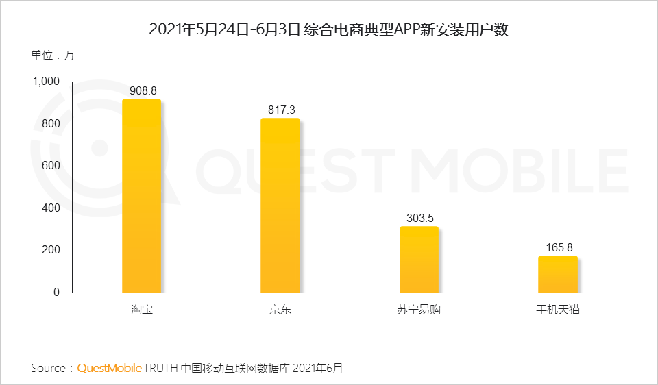 几大平台的用户活跃、新增用户,也基本与此节奏一致,以5.24到6.3期间为例,淘宝新增安装908.8万、京东新增817.3万、苏宁易购新增303.5万、手机天猫新增165.8万。