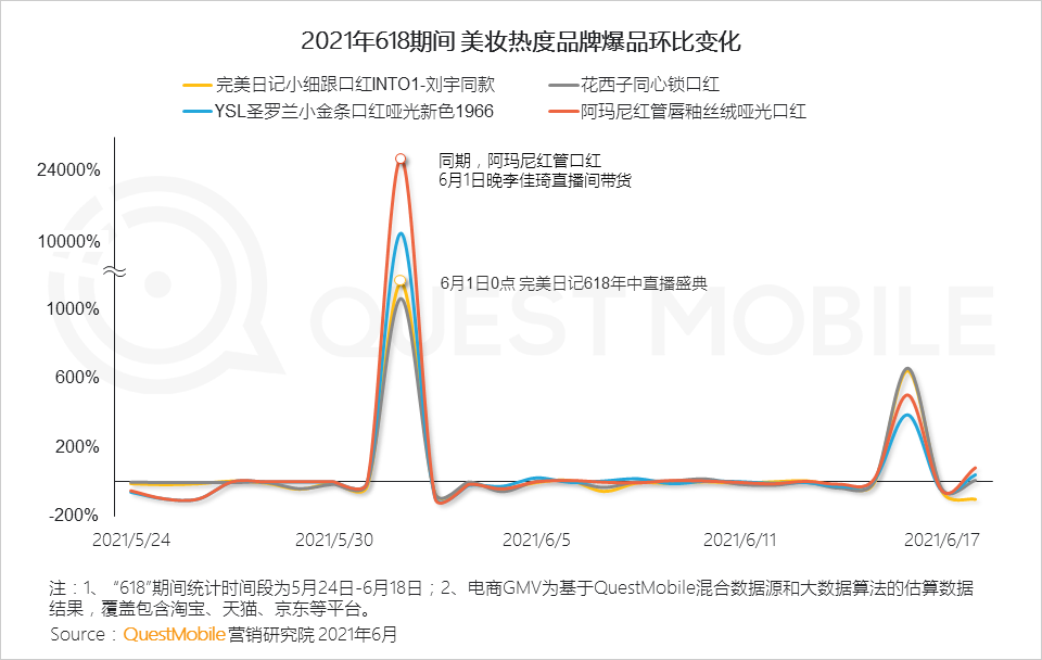 其中,从单品投放上看,爆款商品如花西子口红与圣罗兰口红重点在临近618期间投放,更短链路向电商平台转化。