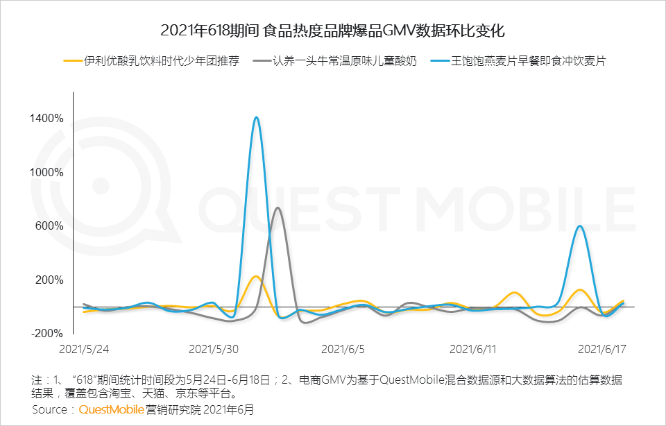 食品行业巨头品牌通过与新生代流量明星合作与新品牌营销竞争,618大促期间,巨头品牌销量保持稳定,新品牌通过大促提升销量,峰值明显。