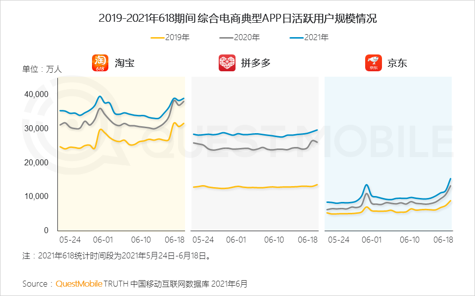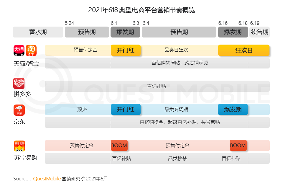 QuestMobile数据显示,今年618,无论是叫做“狂欢”还是叫做“风暴”,电商平台营销时间节奏比较一致,基本都是从5月中旬开始蓄力,下旬开始预售,6月初开始爆发,随后再来一轮预售,到6.18前后再爆发一下……