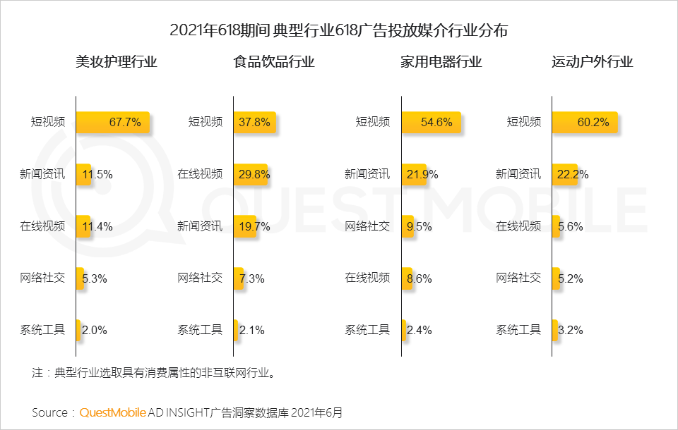 典型行业的广告投放布局多种媒介类型,但整体广告预算均明显倾向短视频。