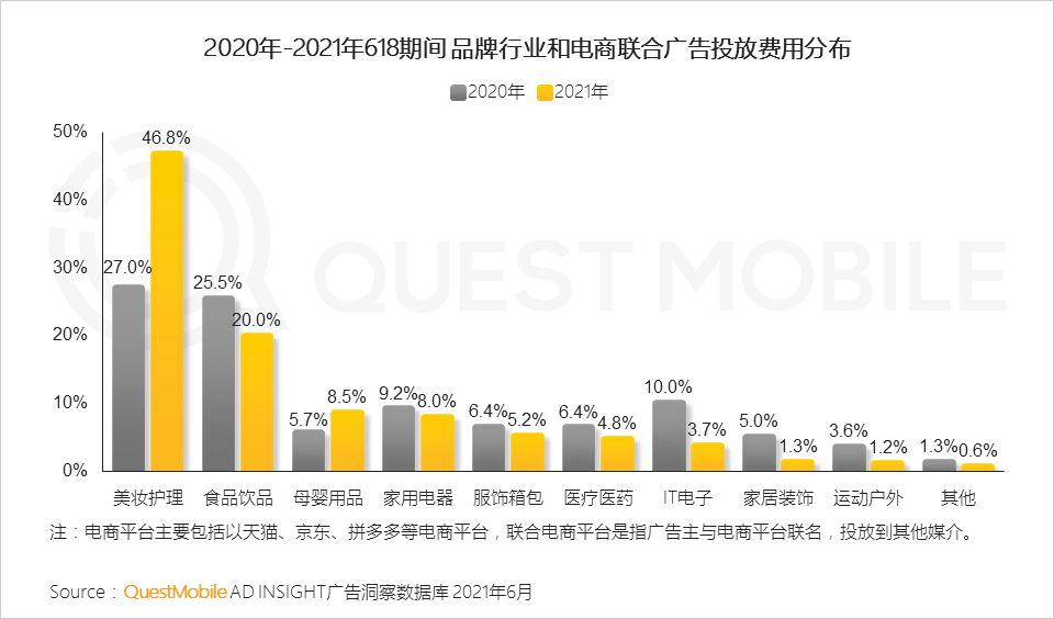 618期间,国产品牌和新品牌在食品、饮料、家电等行业占比较高。