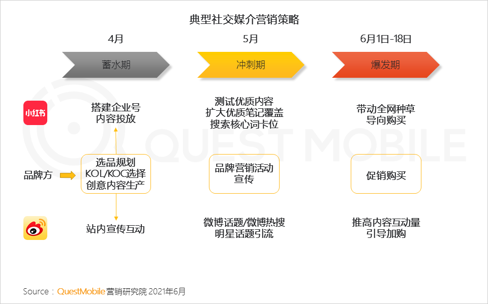品牌方在社交媒介提前布局内容投放为品牌造势,制造内容声量,进一步向购买转化。