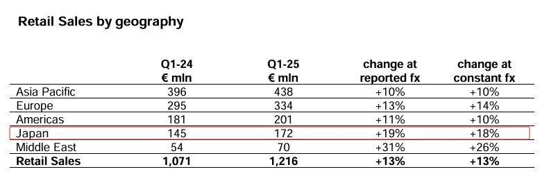 一季度,Prada集团日本市场销售额大幅飙升,图源:财报