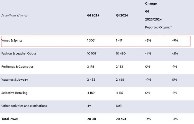 LVMH集团的销售额远不及市场预期,其中酒水业务收入大跌;