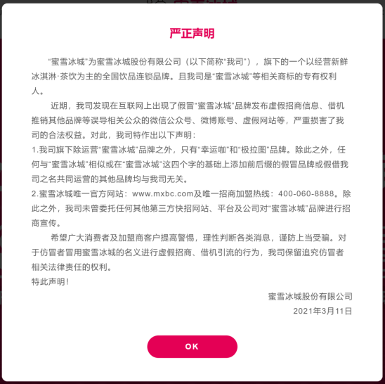 打开蜜雪冰城的官网,一封《严正声明》弹出,正是蜜雪冰城关于虚假招商加盟的声明。明确强调有不少假冒品牌发布虚假招商信息、借机推销其他品牌等误导情况。
