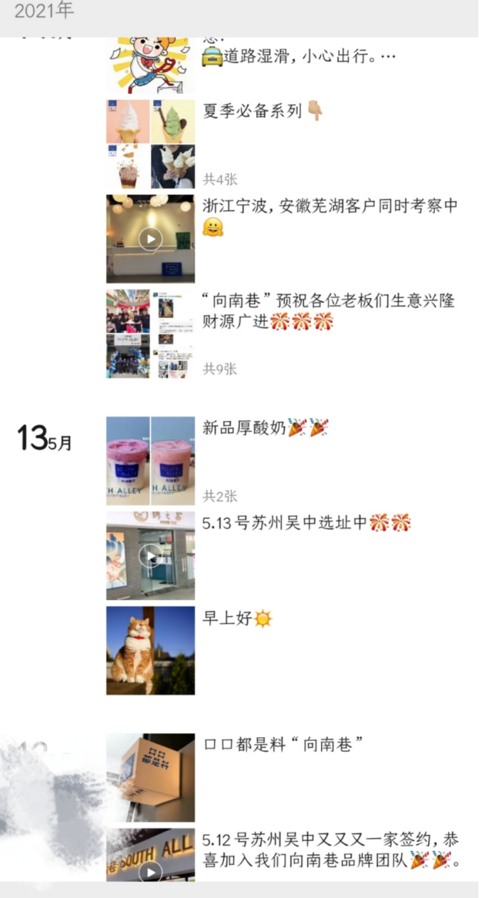 相比之前的麦先生,安经理近两年的朋友圈都与“向南巷”品牌有关,看得出算是非常合格的工作人。