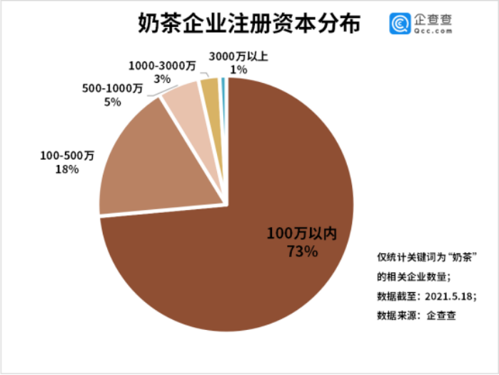 从注册资本来看,注册资本在100万元以内的奶茶企业数量最多,占比高达73%,规模普遍较小。注册资本在100~500万元和500~1000万元的分别占18%和5%。