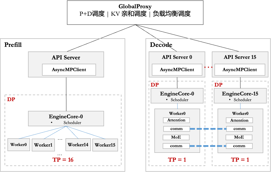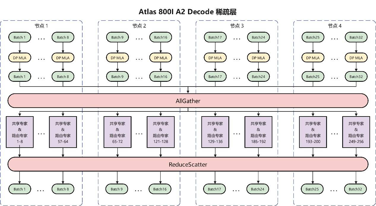 针对 Atlas 800I A2 服务器,由于每个节点包含 8 张昇腾芯片,我们需要采用多节点互联的方式来进行部署。综合考虑模型吞吐和部署灵活性,我们选定使用 2 节点 16 卡作为一个Prefill 实例,4 节点 32 卡作为一个 Decode 实例。为了部署时尽可能灵活,这里选用的卡数较少,这使得整个系统采用较小规模的 EP 并行策略:每张卡上部署 8(Decode)/16(Prefill)个路由专家和 1 个共享专家。在 Decode 阶段,MLA 部分采用 DP 并行策略,通信方式采用AllGather/ReduceScatter 方案。这种部署方式可以在卡数较少的情况下依然达到相当可观的吞吐。值得一提的是,在真实负载下, AllGather/ReduceScatter 通信方案比 Dispatch/Combine 通信方案具有更好的性能表现。综合上述优化方案,我们实现了在 100ms 时延下单卡吞吐达到 723∼808Tokens/s。