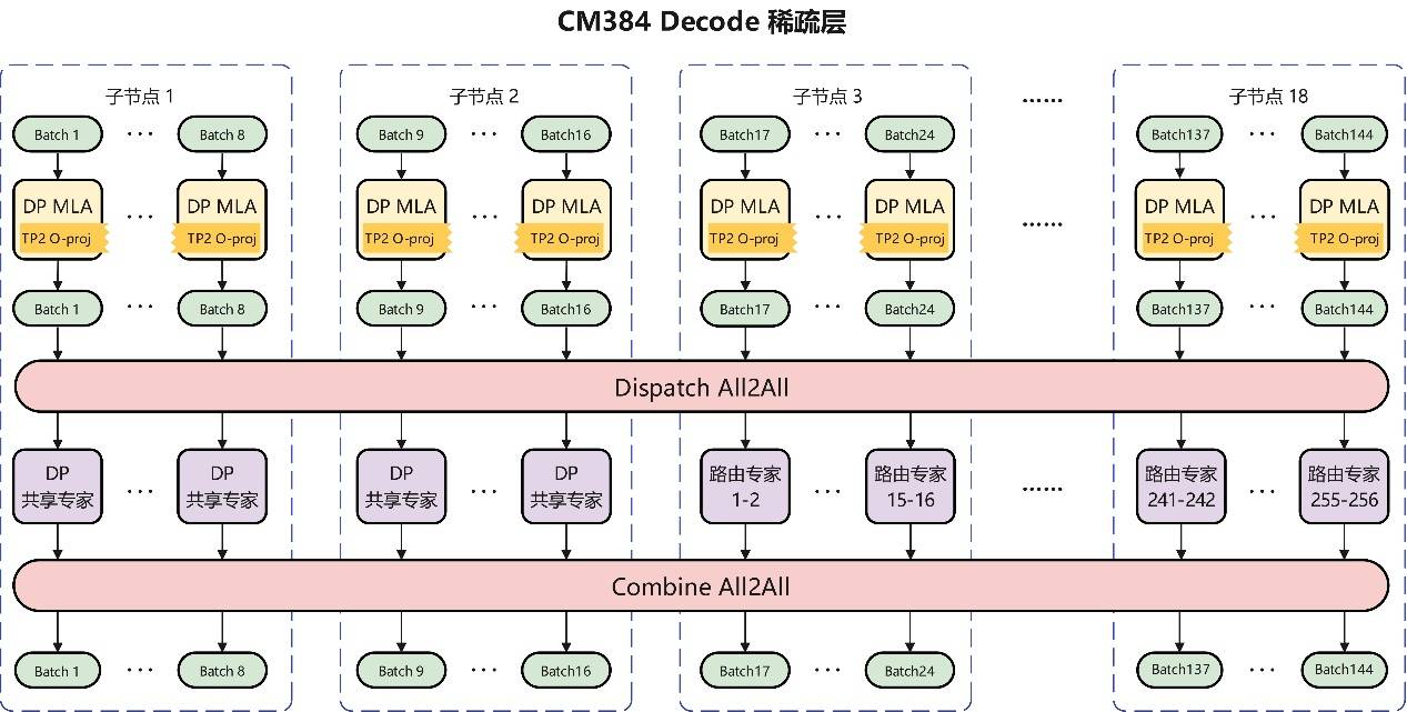 针对 CloudMatrix 384 超节点,其特殊的组网方式使其具有很高的通信带宽。按照 DeepSeek的论文所述,Decode 部分是严重的通信瓶颈,在 Micro-batch 技术的加持下,几乎可以做到通信掩盖其他所有计算类操作。而 CloudMatrix 384 的独特组网使得通信耗时大幅降低,可以有效释放昇腾芯片的算力。因此,针对超节点我们采用大规模 EP 并行的方式来部署:Prefill 使用 16 卡,Decode 使用 144 卡。其中 Decode 部分使用 128 卡通过大规模 EP 的方式部署路由专家,16 卡通过 DP 的方式部署共享专家,MLA 部分使用 DP 的方式进行部署。按照理论分析,超节点可以获得非常高的理论吞吐。实际场景下,由于各种因素的影响,包括 Decode 时延的约束使得各部分耗时未能达到理想的线性度,带宽抢占带来一部分性能劣化,框架的耗时和调度开销带来了额外的时延增加,MLA 部分的序列负载均衡和 MoE 部分的专家负载均衡带来进一步的性能恶化;最后多种因素综合在一起,华为团队实现在保证 50ms 时延下单卡 Decode 吞吐达到 1920 Tokens/s。