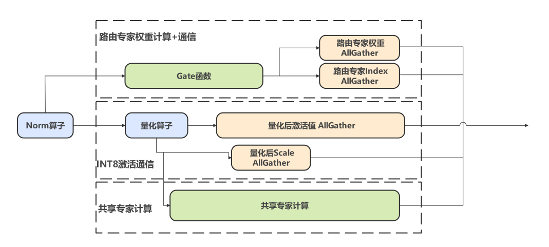 ● 通信通信并发:昇腾芯片也提供了通信和通信并发的机制。当通信带宽利用率比较低的时候,可以把两个通信算子并发起来以掩盖通信算子的启动开销,同时提高通信带宽的利用率。DeepSeek V3模型在进行AllGather 等通信时,可以将Norm 算子和量化算子移到AllGather 通信的前面,从而降低通信的数据量,进而提高通信的效率。但是由于量化算子的前移,需分别通信量化后的激活值和scale,进而增大了通信算子启动开销。由于量化scale 的数据量较小,对带宽的占用较低,因此团队采用通信通信并发的机制,将通信激活值和通信量化scale 并发起来,在不增加激活值通信开销的前提下,掩盖掉量化scale 的通信代价。
