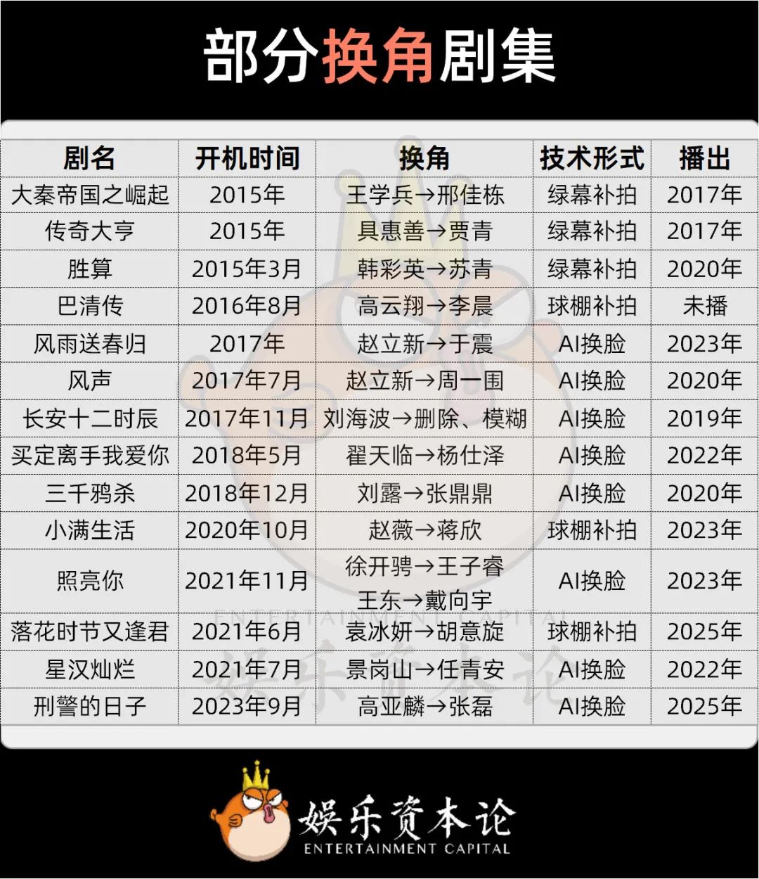 比起“AI换脸”,大家对“绿幕重拍”的印象应该来源于《大秦帝国之崛起》。其中原本饰演白起的演员王学兵因涉毒成为劣迹艺人,总制片人焦阳曾在采访中透露过,“在过审查时,要么他的戏份全删,要么剧不能播。”所以2015年杀青的剧,2017年才得以播出。