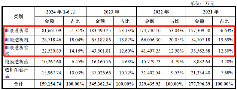 威高血净是医疗行业巨头威高集团旗下从事血液净化业务的公司,主要产品包括血液透析器、血液透析管路、血液透析机以及腹膜透析液。从业务占比来看,血液透析器的占比超过50%,血液透析机和血液透析管路的占比位居二、三位。