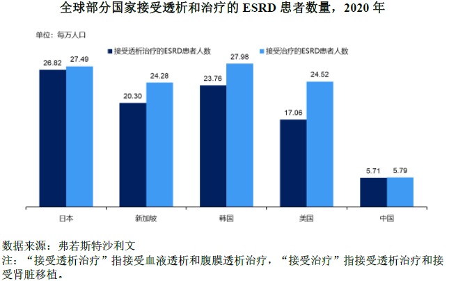 与发达国家相比,目前国内该疾病的治疗率仍保持在较低水平。数据显示,2020年中国接受透析治疗的ESRD患者占比为万分之5.71,远低于日本、新加坡、韩国、美国等发达国家,未来仍有两倍以上的增长空间。