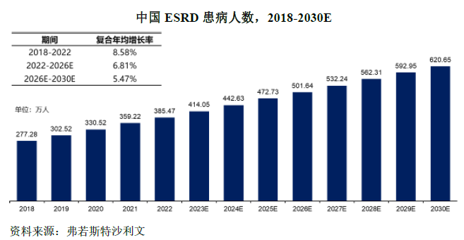 从本质上看,尿毒症的发生与老龄化以及居民的生活方式紧密相关,国内的患者数量持续增长,占全球患者数量的30%以上。根据弗若斯特沙利文数据,2018-2022年,中国ESRD患者数量从277.28万人增加到385.47万人,年复合增长率为8.58%;2022-2026年仍将维持6.81%的复合增速,高于全球平均水平。