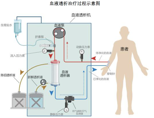 尿毒症患者常见的治疗方式主要包括血液净化治疗(主要为血液透析和腹膜透析)、肾脏移植和肾脏保守治疗。肾脏移植能够显著改善患者的病情,但由于移植来源、肾脏匹配问题和移植排斥反应等原因,其应用范围较为有限。相比之下,血液净化治疗的应用范围更广泛,适用于大多数尿毒症患者。